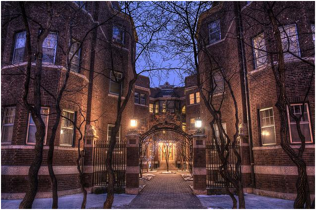 Those who walk around this lovely area have certainly stolen a second peek into the enchanting courtyard of the Highgate. Brick, bay windows, and sinuous trees characterize the way this building meets the sidewalk. The spired conical roof and gables that characterize the Queen Anne revival style create a roofline that is distinguished from other character buildings in the neighborhood.
