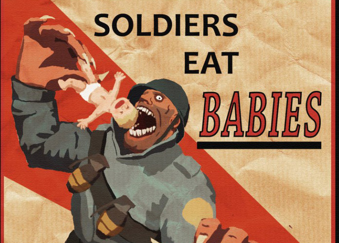 A documentary created by Russia’s state-run Channel one featured a poster they claimed was U.S., anti-German propaganda from WWI. It wasn’t. The poster depicts an angry looking, monster-ish, strong-jawed soldier about to masticate a baby. “Soldiers eat babies. That’s a fact,” reads the poster. “Think of the children. Join Demoman today, and make these monsters pay.” Though such propaganda posters did exist, this one was created by Finnish artist TankTour for the video game Team Fortress 2. [Source: Death and Taxes]