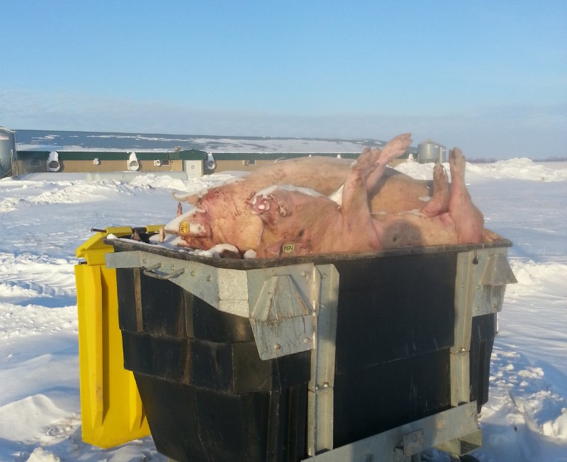 What is shocking about this, especially to someone who immediately got over the fact that a bin packed full of dead animals was set down about 30-feet from a busy highway, is that the farmer or farm-hand who chose this unfortunate location to set down the coffin was ensuring an already beleaguered industry stays on its knees. High feed costs and low meat prices have forced the closure of many barns across the Prairies.