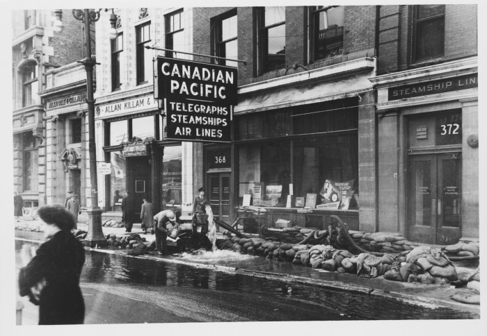 The Flood of May, 1950 was inescapable, even at Portage and Main. Here, hoses are used pump water from the flooded basements of office buildings that in less than 25 years would make way for the massive Trizec and Winnipeg Square developments.