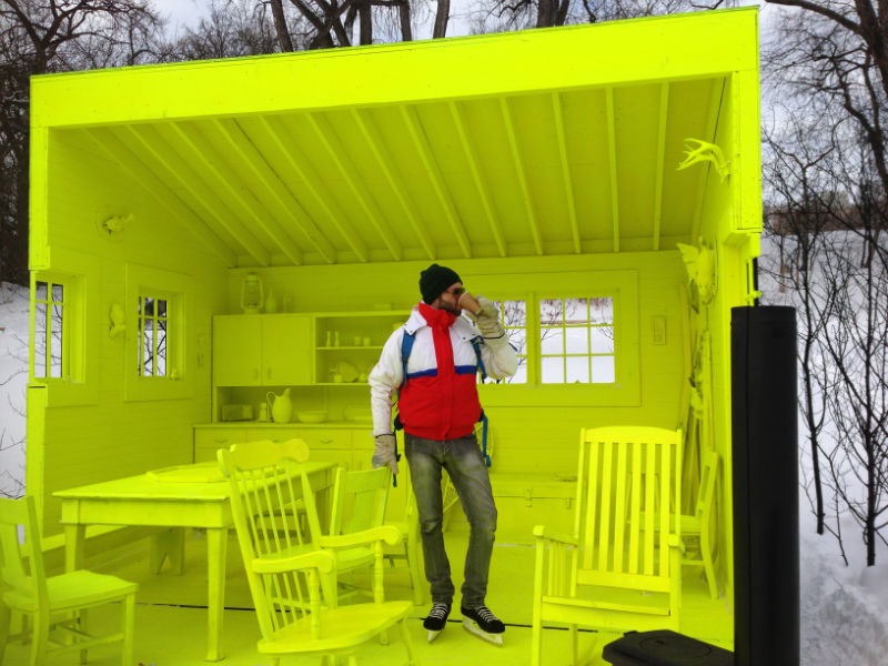 The next hut is a cross section of a traditional cabin in fluorescent yellow. All of the contents of the cabin, save for the (working) woodstove are done in yellow. Hygge House is a photo-op favourite. It also makes you feel more comfortable saying hello to someone from another relay team. Take that crushing social anxiety!