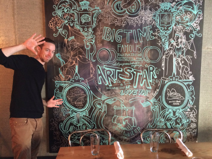 Cyrus Smith standing beside his work, displayed at the Deer & Almond restaurant in Winnipeg. Photo credit: Amber McGuckin.