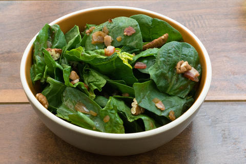 Transfer bacon mixture to a large bowl and toss with the mushrooms. Season to taste with salt and pepper. Add greens and toss to coat with dressing. Serve immediately.