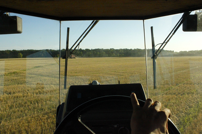 We stopped harvesting to join Jeff’s mother, who had constructed a mini-buffet on a patch of already-combined field. The sort of cooked ham that exhibits a technique perfected over many years — firm but not dry, juicy but not watery — filled our plates next to hearty potatoes and an army of leafy greens. It all came from the farm, or close by. A city dweller might desire to conclude such a meal with a dark espresso and some self-reflexive thoughts on the experience of harvesting, but such delicacies were not to be. Jeff and I washed the food down with homemade ice tea and were off again. Once the sun drops below a certain level the air cools and dew begins. As much harvesting as possible should get done before that point.