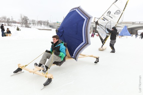 The first annual Winter Wind Derby took place on Saturday, March 5 at 1:00 p.m. at the junction between the Assiniboine and Red Rivers on the Red River Mutual Trail at The Forks. A crowd of spectators and skaters gathered to cheer as four teams entered their wind-powered, personal propulsion contraptions to compete for Wind Derby title on this wonderfully blustery afternoon.