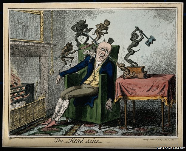 This “Origin of Gout” illustrations captures what many consider one of the most painful medical conditions. The devil is the obvious cause, but closer inspection of what’s on the table and the colour of the musician’s nose reveal, perhaps, the real one.