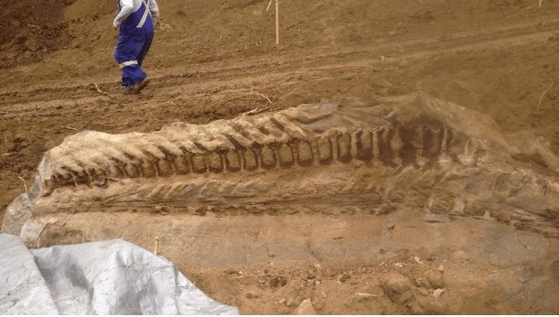 A crew working on a pipeline near Spirit River, Alberta has unearthed a 30-metre long dinosaur fossil. The fossilized dinosaur skeleton was discovered on Tuesday after a backhoe operator accidentally broke off a piece of the fossil when moving some earth.