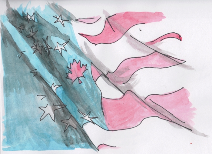 Sure, individual regions of the country have distinct identities, but the country as a whole never really gelled. For instance: the maple leaf as a national symbol? Those big sugar maple trees only really grow from Nova Scotia to Ontario, don’t they? Yeah, I just looked it up on wikipedia. Most of the growing region is down into the States! I rest my case. We are not maple leaves. To quote a Canadian (soon-to-be-American) songstress: “We are stardust”. And we’ve got to get ourselves onto the flag.