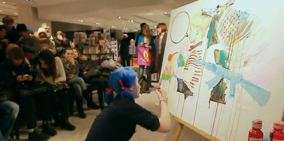 I guess this doesn’t really need any more explanation. The title basically says it all. Here, “grunge” artist Lora Zombie paints a picture, in Moscow, while people watch. Painting as a spectator sport? Okay, I guess that works. People watch golf after all.