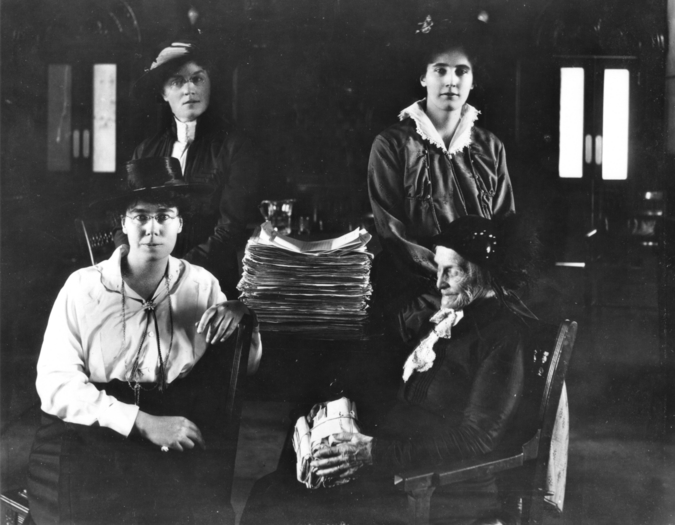 There are plenty of feisty quotable bits in the McClung repertoire without resorting to something she may not have said. I like McClung, who lived in Winnipeg’s Wolseley area at 97 Chestnut Street, a short walk from where I live today, and I like having her as a neighbour. I also like Amelia Burritt, who, at 93, gathered 4,000 signatures for the 1915 petition presented to the Legislature. She is pictured in my favourite Manitoba women’s suffrage photo, and I was glad to see it reproduced in the exhibit. (See featured image: Amelia Burritt at bottom right, and then, clockwise, Dr. Mary Crawford, Winona Flett Dixon, and Lillian Beynon Thomas. Source: Manitoba Archive.)