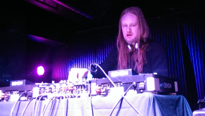 Venetian Snares is Aaron Funk. He’s a longhair, goateed and blackteed, one of those electronic musicians who looks like a Norwegian metal guy. He stoops over his table of gear, twiddles and throttles and taps, and then steps back to groove-nod along for a measure before leaning in again for a redial.