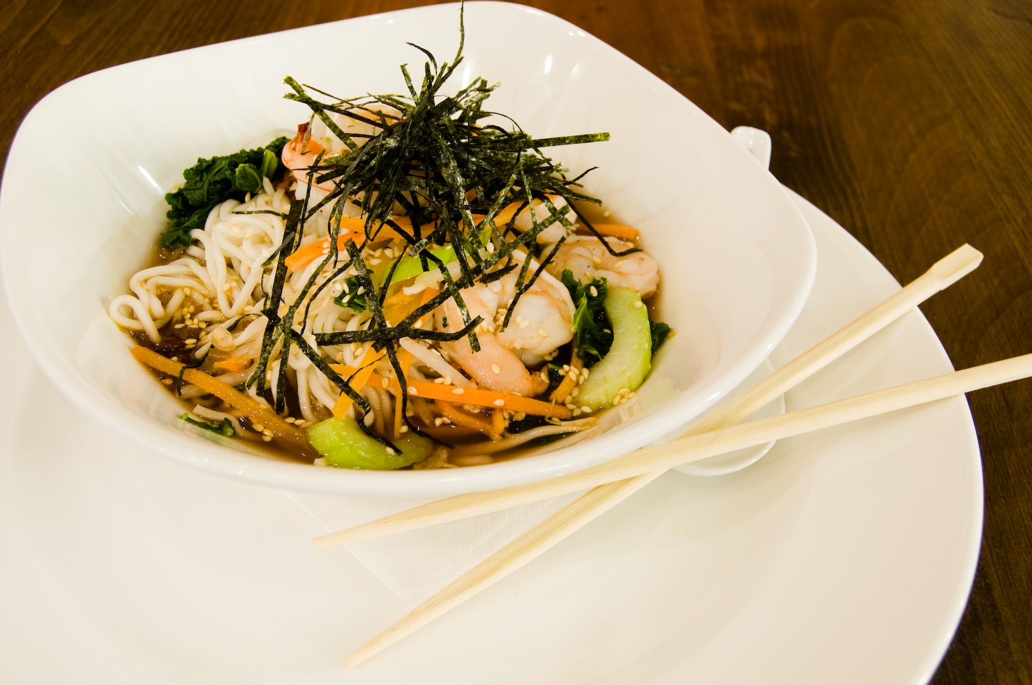 GARNISH: Finely julienne your choice of vegetable. We use: sui choy, red onions, marinated tofu, cilantro, carrot, bean sprouts, green onion, and pickled shiitakes – sometimes even a poached egg. Once again the possibilities are endless.