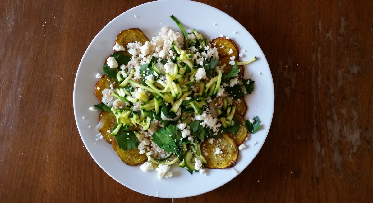 Use the beets to form the base of this delicious rice, zucchini, and parsley “salad” or rice bowl.