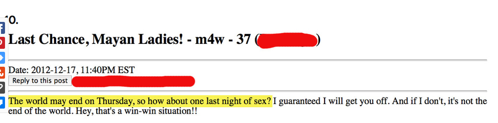 It seems very likely that if you couldn’t get laid before the world ends, then you could be shit out of luck with precious little time left. But people have flocked to Craigslist, hoping to find that one person in the whole world who is as lonely as them to ride it out with (see what I did there?). I think it could be cheaper and less of a jarring experience than just buying a cat and being nice to it, but I also expect to wake up tomorrow, so who cares what I think?