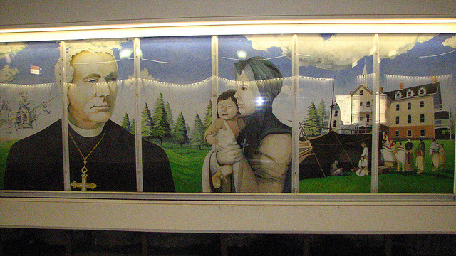 Like the thousands of Edmontonians that ride the LRT everyday, I pass by the Grandin Mural on a regular basis. And, despite its familiarity, the mural troubles me each time I encounter it. Located on the platform of the Grandin/government LRT station since 1990, the mural was commissioned by the French Association of Alberta and presented to the city as a gift. The mural, which depicts Bishop Grandin’s role in the institutionalization of Catholic missions, hospitals and residential schools in Alberta, has become the target of public criticism (most notably seen in several letters to the editor in the Edmonton Journal, starting in 2011).