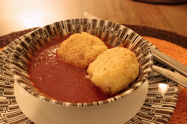 While making dinner the other night, it occurred to me that the arancini Mike was making would make a perfect GCFA (and that I also didn’t have a recipe in mind yet). So, in true lazy man’s fashion, I decided to use his idea. He deserves full credit for these delicious and cheesy rice balls, which are often served at Italian restaurants. They are an Italian tradition, originally from Sicily (and originating in the 10th century, if you believe Wikipedia). They are often served with a simple marinara or meat sauce for dipping. In my family we don’t use the sauce and eat the arancini as is, enjoying their cheesy, gooey goodness. But Mike made a basic, but flavourful tomato sauce, and it complimented them perfectly. The recipe is simple: make risotto, form into balls, bread and pan fry. The mustard and wine gave the rice a nice kick, and the cheese gave it a lot of flavour. This isn’t a recipe you can whip up in 20 minutes, but it’s worth the wait when you eat them.