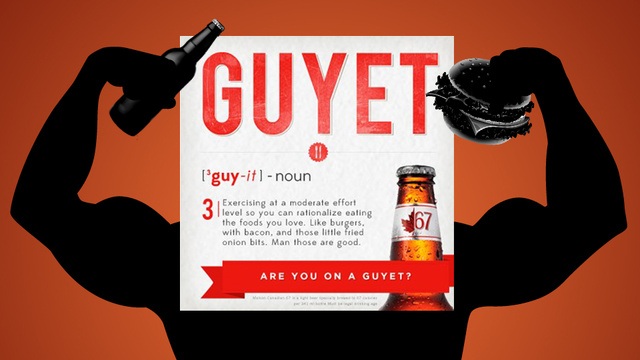 The campaign in question comes to us courtesy of Molson which, in January, rolled out Molson 67 — a 67-calorie beer aimed at dudes who want the beer but not the beer belly. Fine. No problem. The problem lies in the advertising, which I’m sure you’ve probably seen. Molson 67, you see, can be consumed as part of a complete ‘Guyet’ — or “working out to justify the foods you love.”