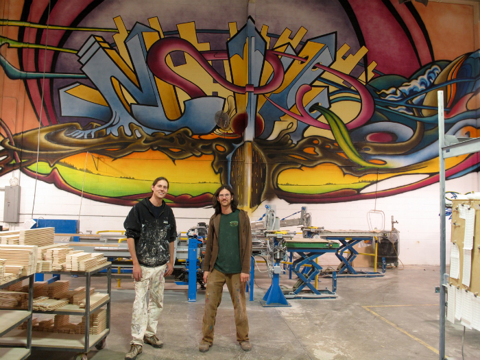 The blank canvas stretched 230 feet along the cabinet assembly line, looming 25 feet over sawdust-coated machinery and a maze of conveyor rollers. Ralph Fehr wanted the factory to have colourful walls, a request fellow artist John Wiebe and I ran with, transforming a time-card work environment into a source of inspiration.