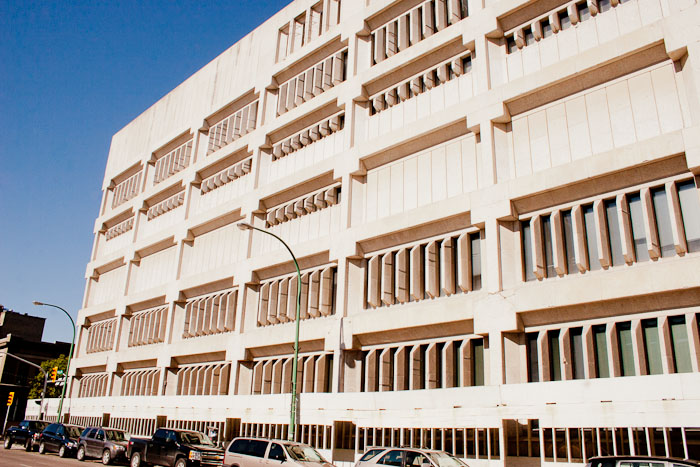 Brutalism arrived in Canada between the 1960s- early ’70s. Brutalist buildings were mainly built for function and revived the principle of ‘form-follows-function’ in modern architecture. Affordability, durability and versatility made brutalism the chosen style for numerous universities, art centers and government buildings across Canada. Winnipeg’s brutalist architecture is prolific and varied. The Pan Am Pool (1966), Robson Hall at the University of Manitoba (1969), the Manitoba Teacher’s Society (1966) and the Winnipeg Transit Garage (1969) are only a few of the examples of brutalism throughout the city. The Public Safety Building (1966) and the Royal Theatre Centre for the Arts (1969-1970) best exemplify the brutalist design in Winnipeg. Both buildings were designed to be in Winnipeg’s burgeoning Exchange District, which was a thriving hub of cultural activity, to attract more people downtown and regenerate the area. The expression of raw concrete and stone in both structures imposes on the personal space of the building’s viewers and demands attention. The sheer enormity and solidity of the PBS blatantly confronts Main Street and the reality of living and working in a downtown.