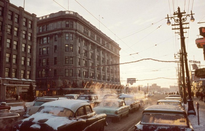 Christmastime rush hour on Portage Avenue near Vaughan Street. Winnipeg’s public policies and development patterns were almost entirely suburban by 1962, but most people in Winnipeg and Southern Manitoba continued to shop on Portage Avenue, which still had a better concentration of retail than the shopping mall at Polo Park that opened three years earlier