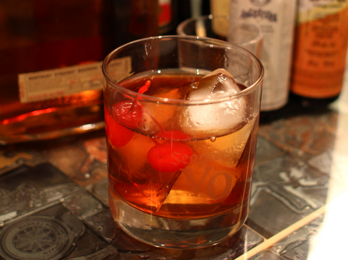 Nowadays Manhattans are made with either Rye or Bourbon. Rye will give the cocktail a spicier finish while Bourbon keeps it sweet. At Bistro 7 1/4 we make our Manhattans with an ounce of each to balance out the differences and serve it on the rocks.
